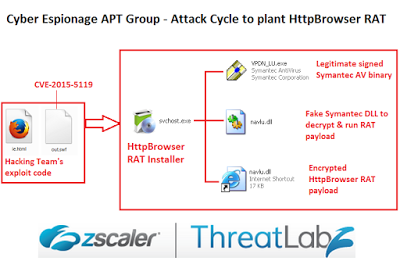 Zscaler's cloud sandboxes recently detected a Remote Access Trojan (RAT) being delivered by a well-known Chinese cyber espionage group using the Hacking Team’s 0-day exploits. This attack was specifically targeting a well-known financial services firm. The exploit files involved were identical to the Hacking Team's leaked exploit HTML, JavaScript, and ShockWave Flash 0-day files. The end payload that was installed is the HttpBrowser RAT, known to be used by the Chinese group in previous targeted attacks against governments.
