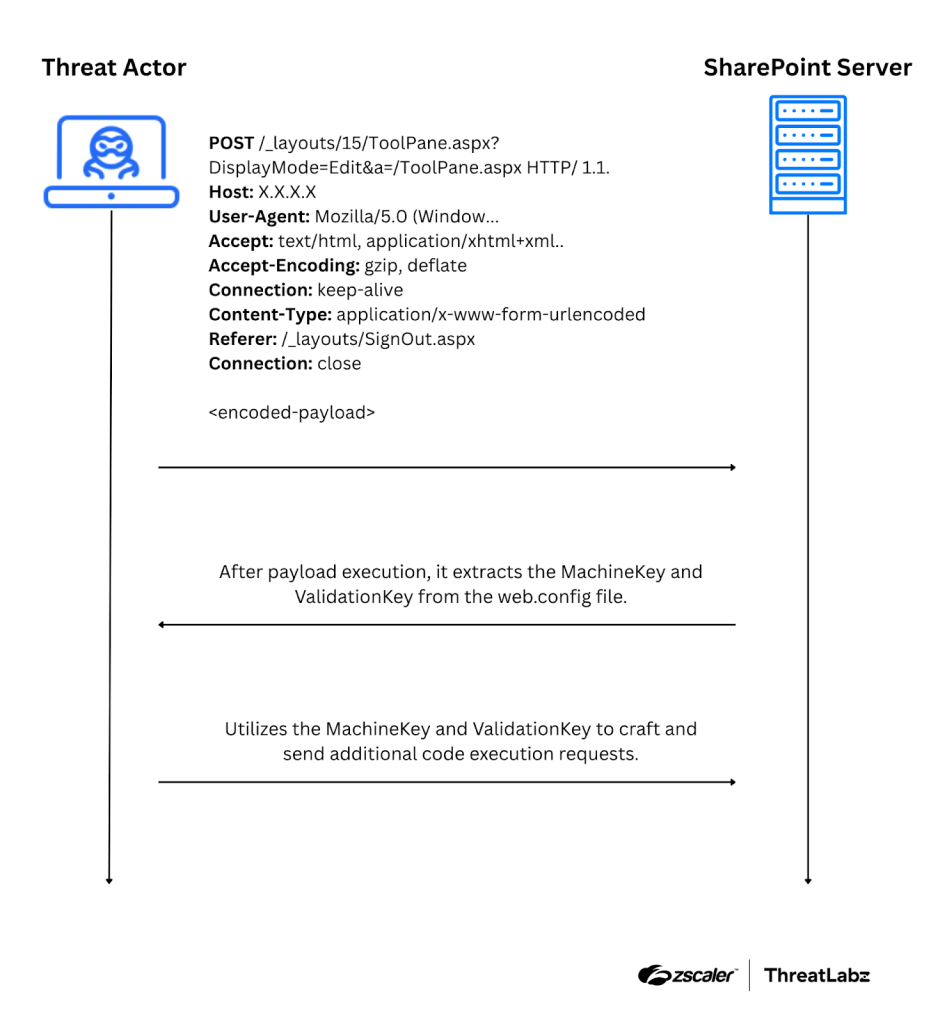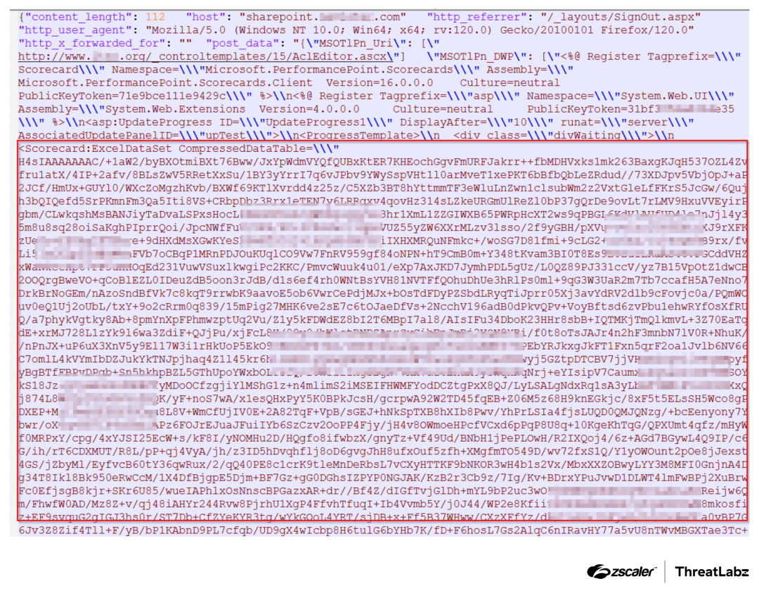 Zscaler ThreatLabz analyzed SharePoint logs related to CVE-2025-53770 activity, captured using Zscaler Deception decoys, to identify suspicious transactions that reveal the exploit mechanics. Key findings include: