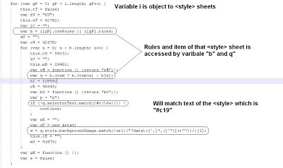Looking at the code above, we can see there are some garbage or useless variables and functions are declared for no purpose, such as variable “l”, “v” and function “nB()”. There are many such garbage variables and functions declared throughout the script. They are never used for any significant purpose. So we will skip those dirty useless variables, functions. We will only concentrate on useful variables, code and functions used for decoding this malicious JavaScript. There is variable “g” declared with a “new Date()” function, which is in the form of an array. The first array element is a year and second is a month and so on. Then variable “o” is defined with a “g.getMonth()” function which means variable “o” will contain value “10” which is the second array element and called as month. Then variable “r” will contain the string “from10e”. The value 10 in this variable and is replaced by the “CharCod” string, so finally we have an interesting string in variable “r”, which is nothing but “fromCharCode”. Variable “i” is defined with object “document.styleSheets”, which will return list of style sheets. Let’s decode the second part of the main script,