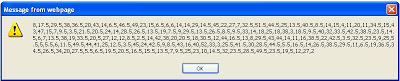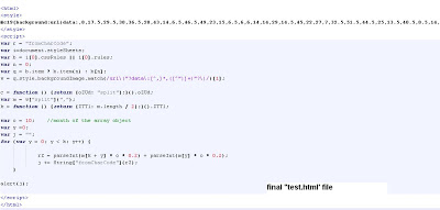The above “for()” loop will actually extract the array data from the style tag defined earlier. I have put some comments inside the image to better explain the components of the code. Initially, variable “q” is matched with elements corresponding to the style sheet rule with the help of the “.selectorText” property. If the loop matches the string”#c19” of the style sheet, the code will continue. The next variable “w”, actually retrieves the array from the style sheet rule with the help of the property “.style.backgroundImage”. Now, we finally have useful variables. At this point, we should test to ensure everything seems reasonable. Let’s create a simple “test.html” file and add only important variables, style sheet tags and code inside the HTML file. We will test what the variable “w” will contain after above code with the help of “alert()” function. The sample HTML file is shown below: