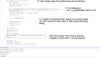 The above code is the last part of the main malicious script. Here we will finish the decoding of the code and will come to determine the main malicious code behind this. As analyzed earlier, variable “k” will contain value 90 and this “for()” loop will run 90 times. The function “parseInt()” is used to obtain the exact integer. The variable “o” will contain the month of the date object, which is 10. The variable “r” contains the string “fromCharCode”, which we found earlier. So finally variable “j” will look like,