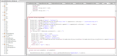 From above screenshots, you can see that the application is using the XML listener service. Also, in the second screenshot, you can see that the application is trying to create a URL by assembling various strings. This is likely command and control (C&C) communication sent to a master server. The parameter &imei denotes the harvesting of the phone's IMEI number for tracking the device.