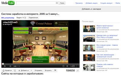 The right side of the page, looks like Adsense ads from Google (same font, same colors, layout, etc.), but they are all links to www.tvoitube.com. This is a YouTube look-alike site, which contains a video shown promoting an online gambling site (www.cristal-casino.com).