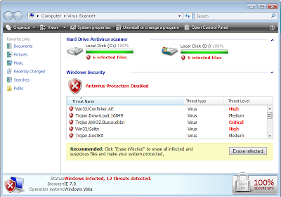 Recently however, I've seen new versions of this fake AV page start to emerge. Visually, they look the same, but they use Javascript obfuscation, and leverage new domains. Most of these new pages were not blocked by Google SafeBrowsing, even several days after we first first encountered them.