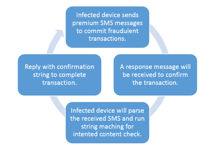 The intention of the malware author is clear from these message strings. The app generates fraudulent transactions from an infected device by purchasing on-demand videos and premium SMS services controlled by the attacker. SMS messages are generated by the app to initiate a purchase. The app then monitors incoming SMS messages to identify the purchase validation message, which must be accurately responded to in order to complete the transaction. When the validation message has been intercepted, it is parsed and matched against the hardcoded strings in the image above, to determine and submit the appropriate response. Once this occurs, the transaction is complete and the victim will be charged by their mobile provider.