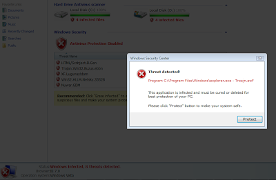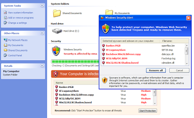 The hacked French site then redirects the browser to a fake AV page. I've seen redirections to four different fake AV domains, and only one of them was blocked by Google Safe Browsing - ryuk4.co.cc was blocked while savewarez54.co.cc, richav8.co.cc and richav2.co.cc were not. I also witnessed six different versions of the fake AV page. One seemed to be broken, it displayed the "loading..." animation, but did not ultimately deliver fake AV page. Instead, it directly attempted to download the malicious executable. Here is the screen shot of the five variations of the fake AV page: