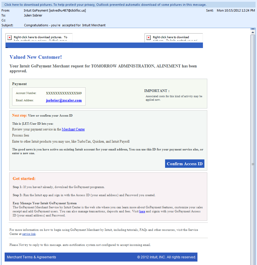 If you want some examples of hijacked websites redirecting users to malicious pages, you can take a look at your inbox. Just this morning, I received four similar messages about a fictitious payment sent to me through Intuit: