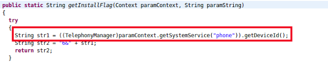 Assets.getInstallFlag gets the IMEI (or ESN number in case of CDMA devices)