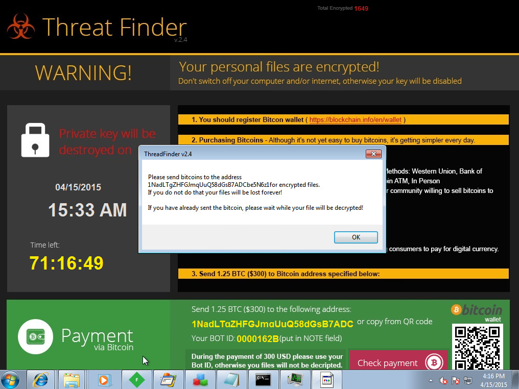 A recent development we’ve observed is using Bedep to install ransomware as well as committing advertising fraud. In the observed sample, Angler EK first installed Bedep on the compromised system, which immediately downloaded a piece of ransomware called “Threat Finder v2.4.” Like other popular ransomware, Threat Finder displays a “HELP_DECRYPT” message which instructs users to send 300 USD of Bitcoins to a Bitcoin wallet in order to decrypt files. The screenshot below shows both the Threat Finder ransom window and advertising fraud sessions captured by Fiddler. Installing both ransomware and committing advertising fraud potentially generates even more money for the perpetrators.