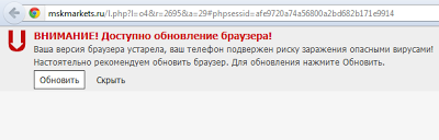 These pages redirect to another domain, mskmarkets.ru (hxxp://mskmarkets.ru/l.php?l=o4&r=2695&a=29#phpsessid=afe9720a74a56800a2bd682b171e9914) where users are warned in Russian that their browser is out of date: