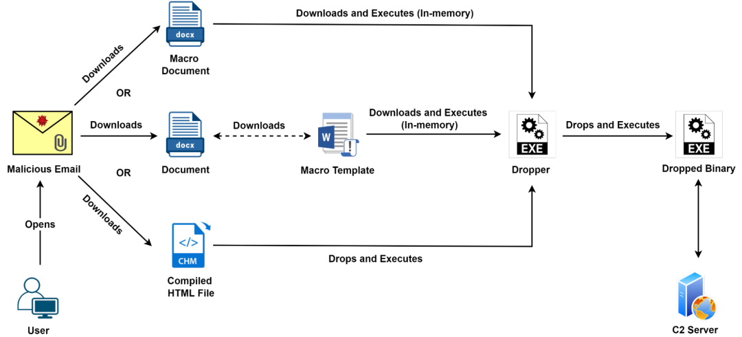This threat actor has frequently updated its attack chains over the last two months. We identified three unique attack chains used by the threat actor to distribute the malware in emails: