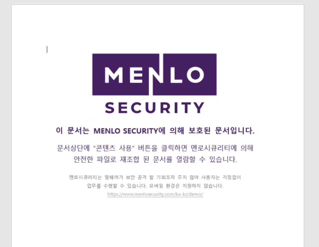 Figure 3 below shows that the decoy content of the document is related to Menlo Security company. This is consistent with other decoy contents used by the threat actor. For instance, in the document with MD5 hash: 1a536709554860fcc2c147374556205d, the decoy content used was related to Ahnlab - a Korea-based computer security company. This is done for the purpose of social engineering.