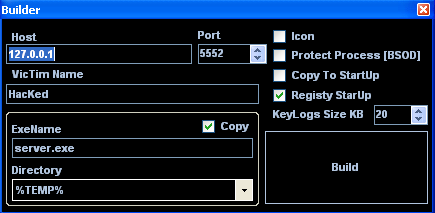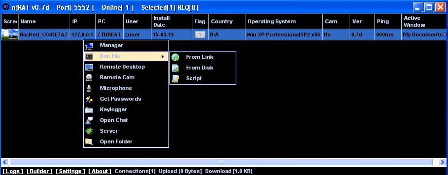 The latest instances of njRAT infections we have seen are for version 0.7d. Below are some screenshots of the njRAT's control panel accessible to the attacker: