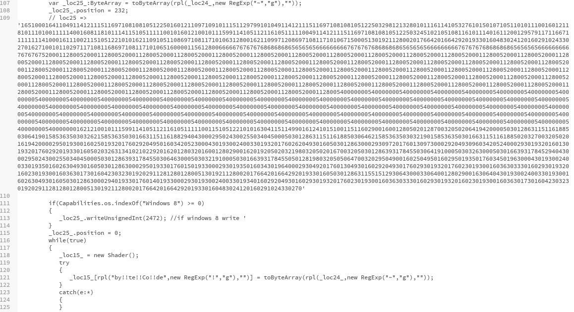 The Flash exploit payload that gets downloaded is highly obfuscated to evade AV detection. Below is a snippet of decompiled code from this Flash exploit:
