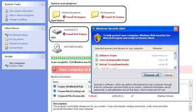 Last week, I talked about heavy obfuscation being used by attackers to hide their HTML source code from detection. This time we came across an interesting fake antivirus website, which not only continually changes the source of the webpage but also the malicious binaries being used in the attack. This occurs when you revisit that same malicious site. The malicious site also changes certain strings used inside the animation sequences. For this blog, I have visited that site a few times in span of a minute and collected the various source files and malicious binaries. Here are the screenshots of fake security warnings for different visits: