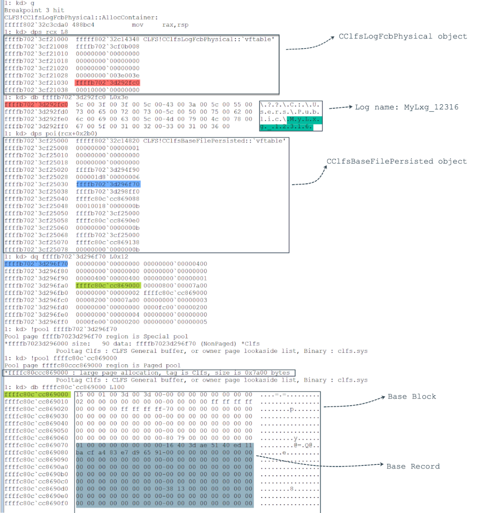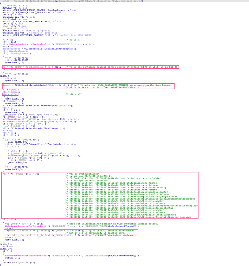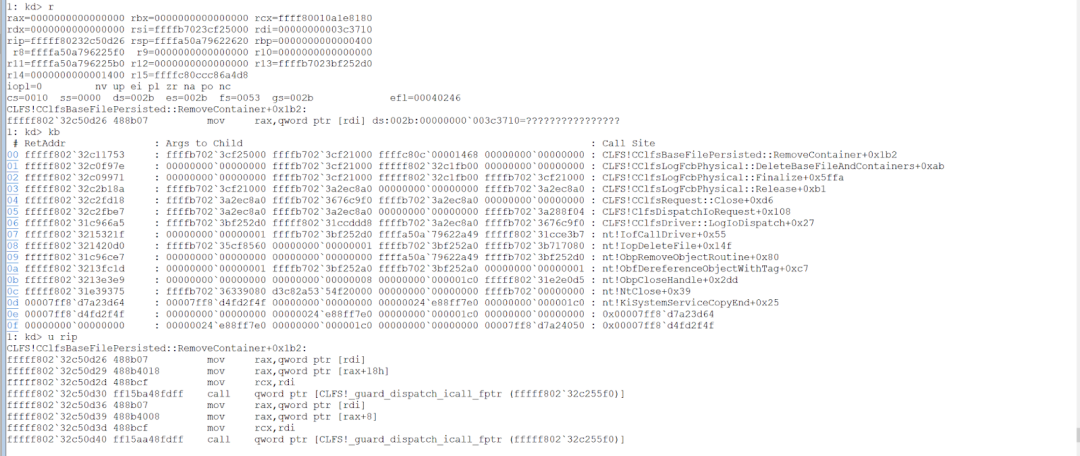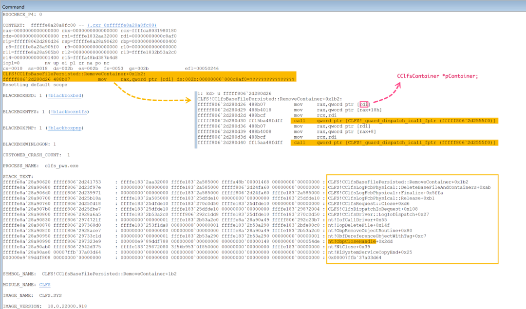 Finally, the breakpoint at CLFS!CClfsBaseFilePersisted::RemoveContainer can be set to trace when the corrupted pointer to the CClfsContainer object in the CLFS_CONTAINER_CONTEXT structure in the Base Record is dereferenced.