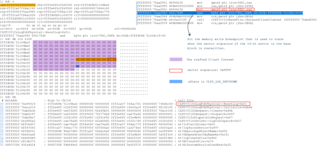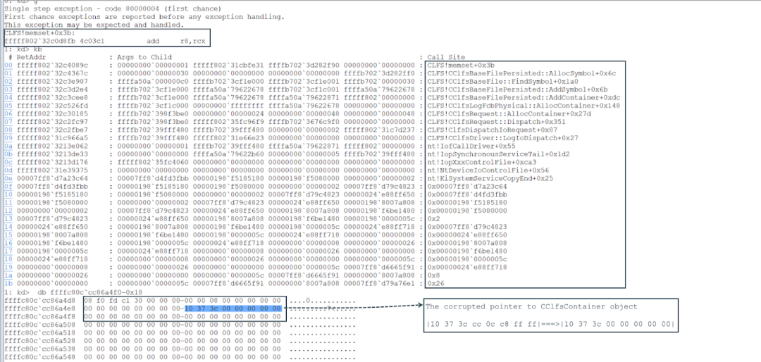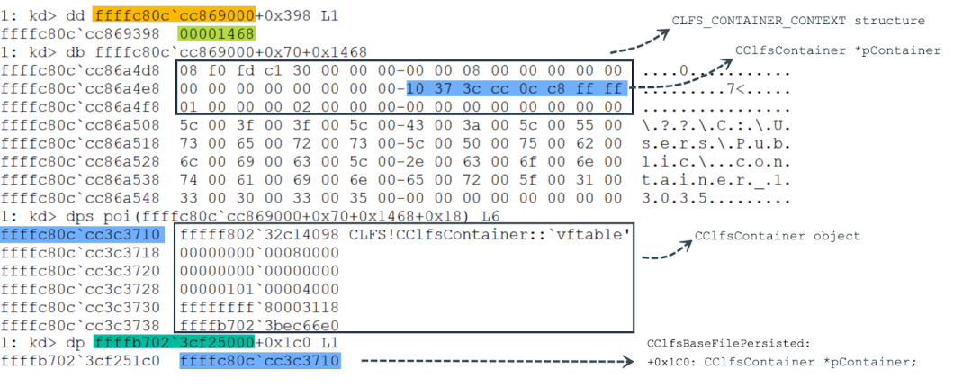 At offset 0x1C0 in the CClfsBaseFilePersisted object, a pointer to the CClfsContainer object is stored which comes from the field pContainer in the CLFS_CONTAINER_CONTEXT structure. At this point, a memory write breakpoint at CLFS_CONTAINER_CONTEXT+0x18 can be set to trace when the pointer to the CClfsContainer object in the CLFS_CONTAINER_CONTEXT structure is corrupted. Another memory write breakpoint at offset 0x1C0 in the CClfsBaseFilePersisted object can be set as follows:
