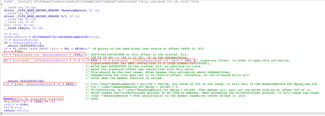 4. The function calls memset() which causes an out-of-bound write at an invalid offset v10, which falls into the CLFS_CONTAINER_CONTEXT structure in the Base Record for MyLxg_xxx.blf, leading to a corrupted CClfsContainer pointer at offset 0x18 in the CLFS_CONTAINER_CONTEXT structure.
