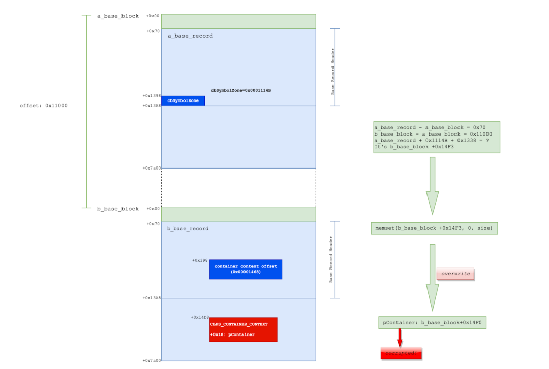 Figure 15 shows how the out-of-bound write occurs, leading to a corrupted pointer in the CClfsContainer object.