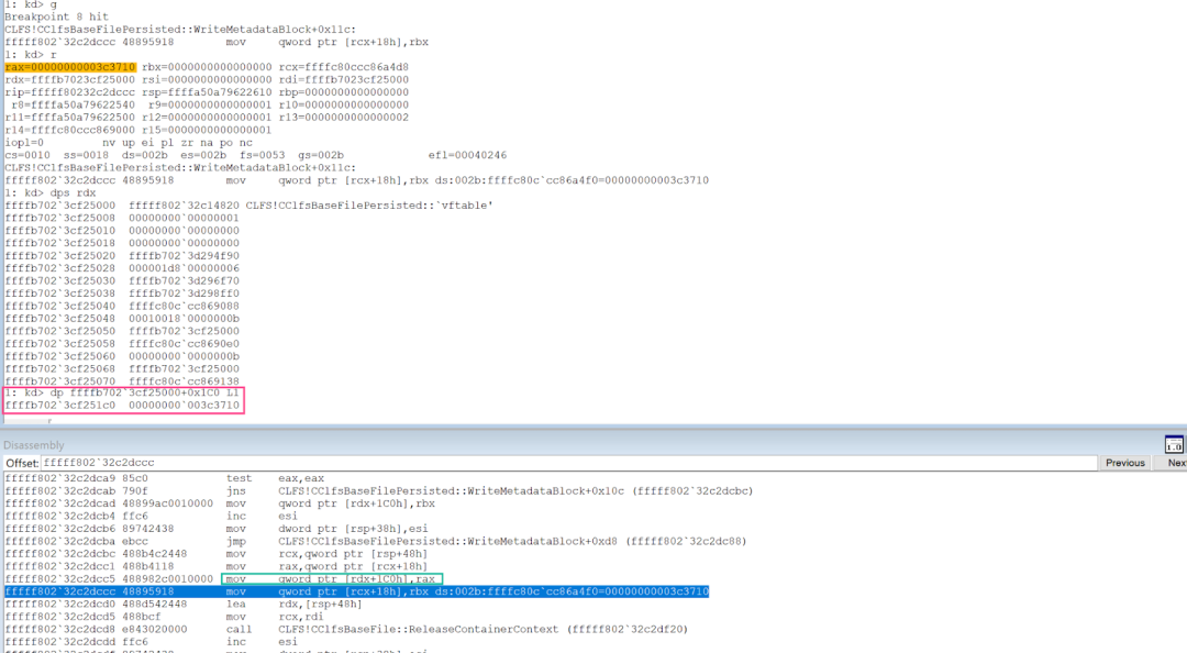 1: kd> ba w8 ffffc80c`cc86a4f0 //CLFS_CONTAINER_CONTEXT: +0x18