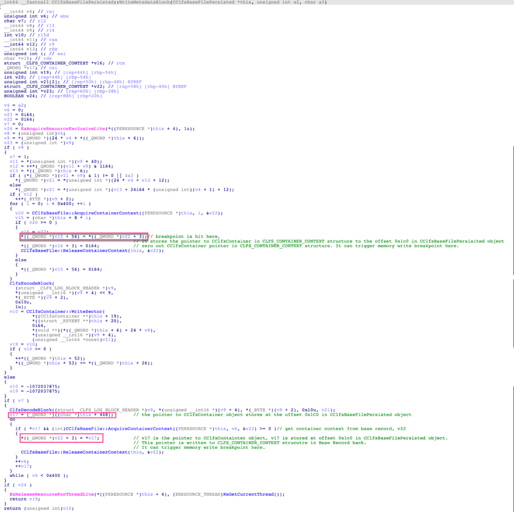 Figure 17 shows the pseudocode of the ClfsBaseFilePersisted::WriteMetadataBlock function after the corrupted pointer to CClfsContainer is stored at offset 0x1c0 in the CClfsBaseFilePersisted object. The code zeros out the field of the pointer to the CClfsContainer object in the CLFS_CONTAINER_CONTEXT structure. After decoding the block, the pointer to the CClfsContainer object is restored in the CLFS_CONTAINER_CONTEXT structure from the offset 0x1c0 in the CClfsBaseFilePersisted object.