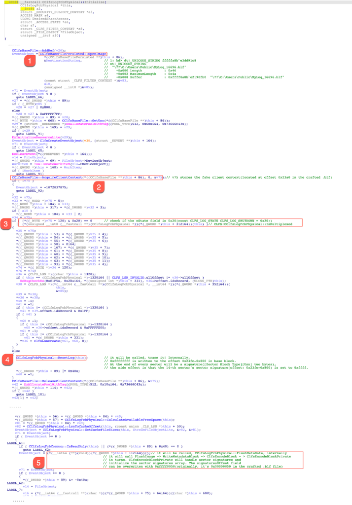 When the CreateLogFile function is called in user space, CLFS!CClfsRequest::Create is responsible for handling this request. When the CreateLogFile function is used to open an existing base log file, the function CClfsLogFcbPhysical::Initialize is called in CLFS.sys. Figure 20 shows the pseudo-code snippet of the CClfsLogFcbPhysical::Initialize function.