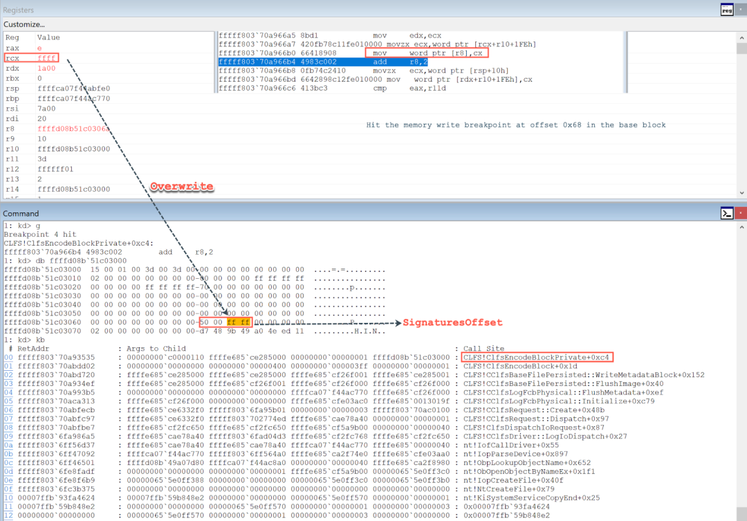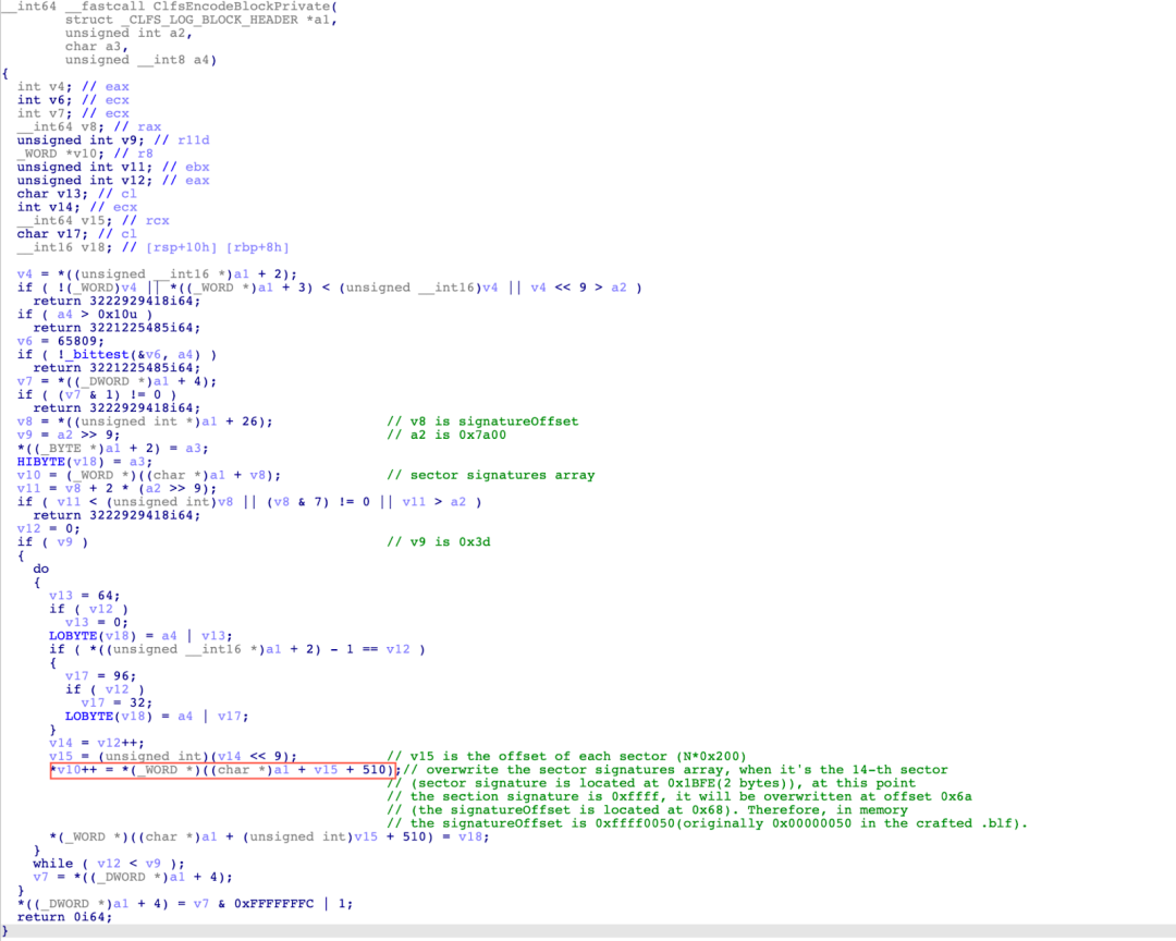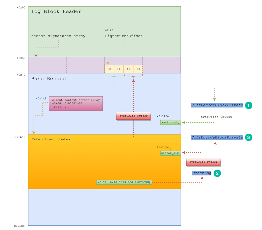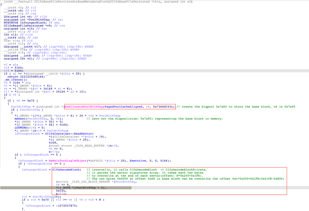 Figure 21 shows the pseudo-code snippet of the CClfsBaseFilePersisted::ReadMetadataBlock function, where  the ExAllocatePoolWithTag(PagedPoolCacheAligned, 0x7a00, 0x73666C43u) is called to create a bigpool to store the base block, followed by initializations, and then the ClfsDecodeBlock function is called to decode the block. In the ClfsDecodeBlock function,  the ClfsDecodeBlockPrivate function is called to parse the sector signatures array that is located at offset 0x50 (the value of SignaturesOffset) in the base block. Two bytes are required to overwrite the sector signature of each sector. These two bytes 0x0050 at offset 0x68 in the base block can be overwritten to the offset 0x19FE (0xC*0x200+0x1FE) where the sector signature of the 13th section is stored. At this point, we can set two memory write breakpoints which are located at base_block+0x68 and base_block+0x200*0xE-0x8. The purpose of setting these two memory write breakpoints is to trace when the sector signature of the 14th sector in the base block is overwritten, and the SignaturesOffset field in the base block is overwritten to 0xFFFF0050.