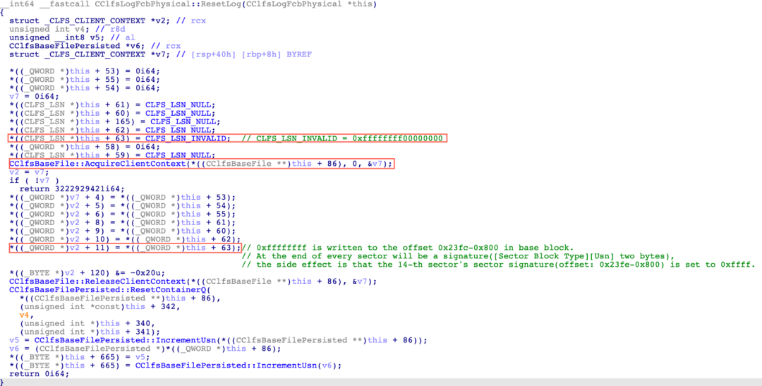 4. Call the CClfsLogFcbPhysical::ResetLog function due to the condition being false in Step 3. Figure 22 shows the pseudo-code snippet of the CClfsLogFcbPhysical::ResetLog function. The 8 bytes located at base_block+0x1BF8 are set to 0xFFFFFFFF00000000. The sector signature is located at offset base_block+0x1BFC. Therefore, the sector signature is overwritten with 0xFFFF. Figure 23 demonstrates that the sector signature is overwritten in WinDbg.
