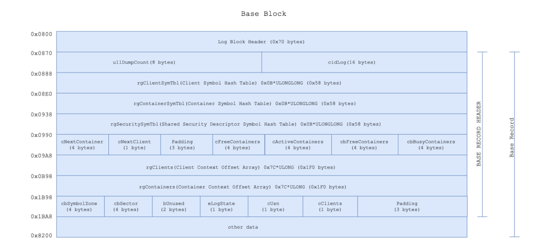 In Figure 1, the Base Block starts at offset 0x800 and ends at offset 0x71FF in a .BLF file and starts with a Log Block Header (0x70 bytes), followed by the Base Record Header, followed by records. The Base Record Header can be represented by the CLFS_BASE_RECORD_HEADER structure described in Figure 2.