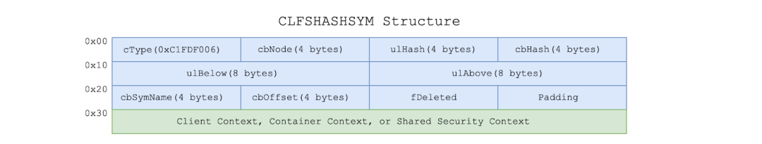 In the Base Record, the Client Context, Container Context, and Shared Security Context are represented by symbols, which are preceded by the CLFSHASHSYM structure defined below: