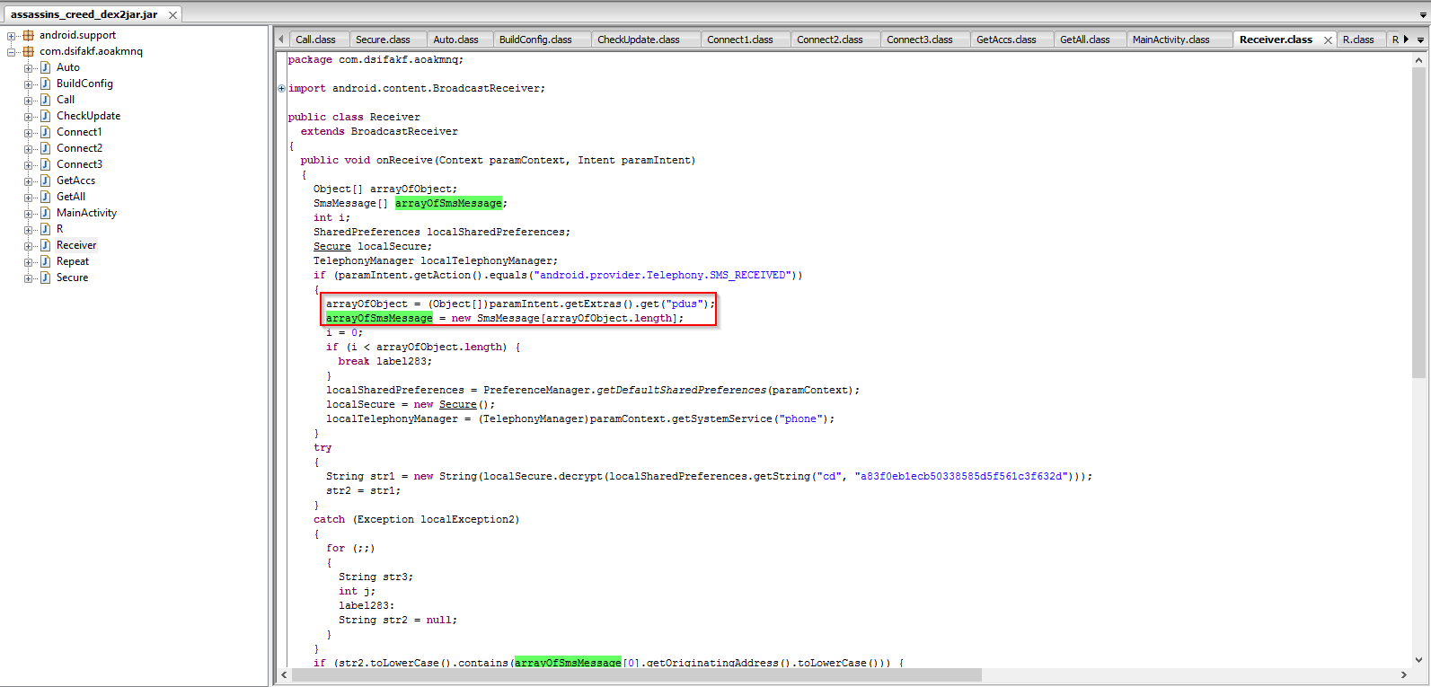 Code snippet showing the SMS interception and storage arrays: