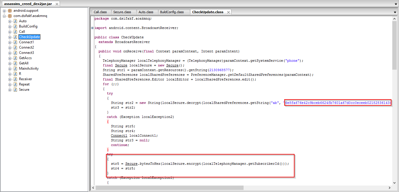 The malicious application is capable of sending multi-part text messages, harvesting text messages from a victim's device, and sending stolen information to a remote Command & Control (C2) server. We were able to locate phone numbers belonging to Russian bank "Volga-Vyatka Bank of Sberbank of Russia" in the malicious application code for which SMS messages are being intercepted to steal sensitive information. Another interesting feature we saw is the usage of AES encryption for all the C2 communication. It also harvests the mobile number and Subscriber ID information from the victim device for tracking purposes.