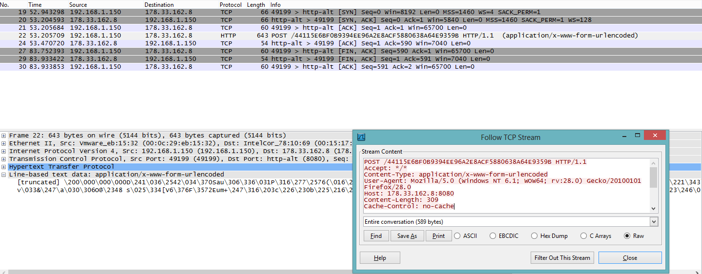 The common factor across all of these dropped files is that they all POST bzip2 compressed data which is then encrypted with a 16-byte random RC4 key via HTTP as reported by StopMalvertising.  We're seeing a growing number of attacks which utilize this method of phone home activity. The case of this Asprox threat phones home over ports 443 and 8080.