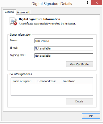 The downloaded malware executable is a highly obfuscated .NET binary, which is digitally signed with a certificate issued to “SBO INVEST”. The certificate was promptly revoked by DigiCert when notified and, therefore, is not active in any attack. We noticed a newer variant arose within two weeks of the first variant, using another certificate issued to "SBO INVEST' that is also revoked.