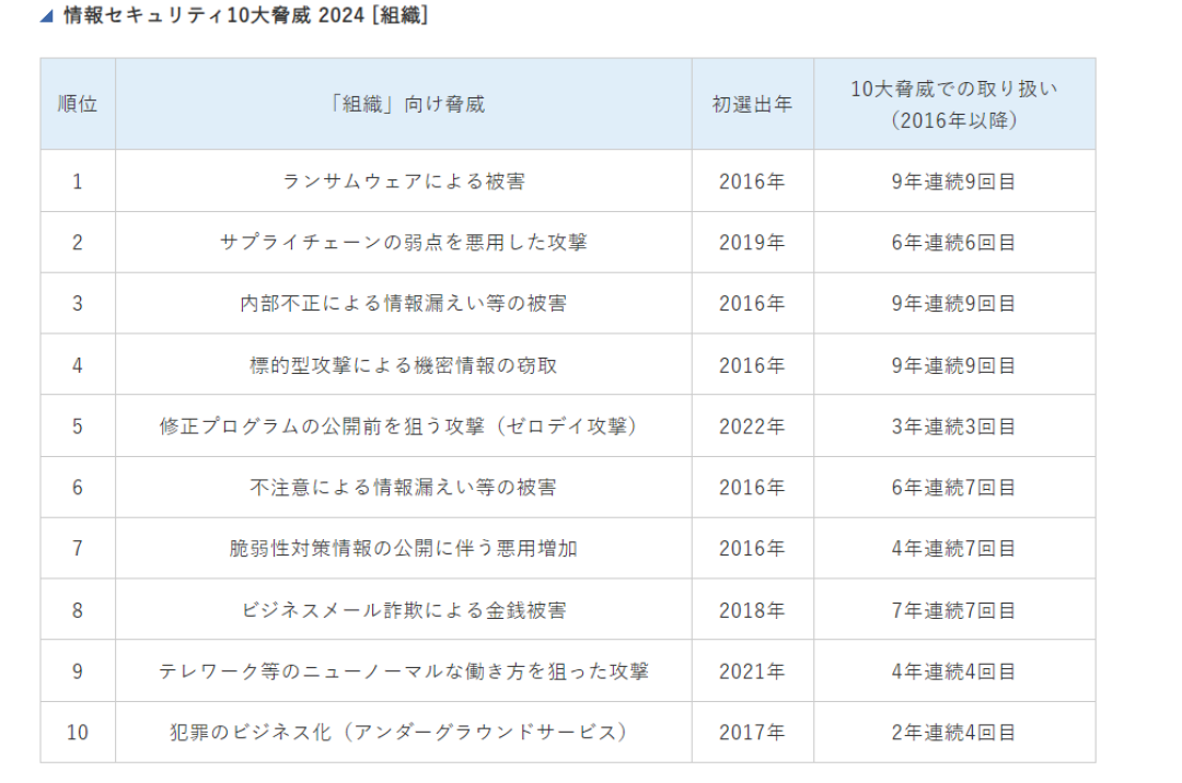 引用:IPA 独立行政法人情報処理推進機構「情報セキュリティ10大脅威 2024」