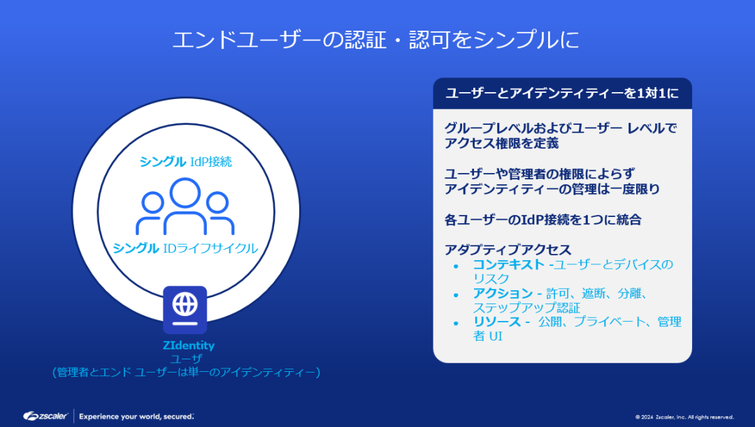 Zscalerでは、「OneIdentity」をキーワードに、管理者やエンドユーザーを統一されたID管理ができるよう、プラットフォームの拡張を進めています。また、ID管理を徹底しセキュリティを強化するためには、ユーザーやデバイスのアクセスや権限を、リアルタイムの情報も含めて管理することが重要です。Zscalerでは、ユーザーの活動パターンを継続的に認証・評価・監視し、自動化されたアダプティブ(適応型)アクセスを取り入れることが可能となっており、常にセキュアな状態を保つことを実現します。本セッションでは、この具体的なアダプティブアクセスの内容についてご紹介します。