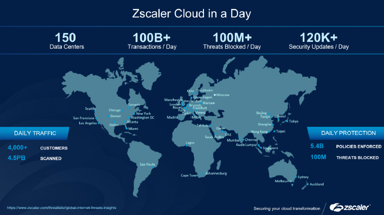 Fast forward a decade, 5 million lines of code, and over 100 issued patents later, here we are today. The Zscaler cloud flourishes across 150 data centers, processing 100 billion transactions per day, stopping around 100 million threats daily for 4,000 global customers with employees located in 185 countries.
