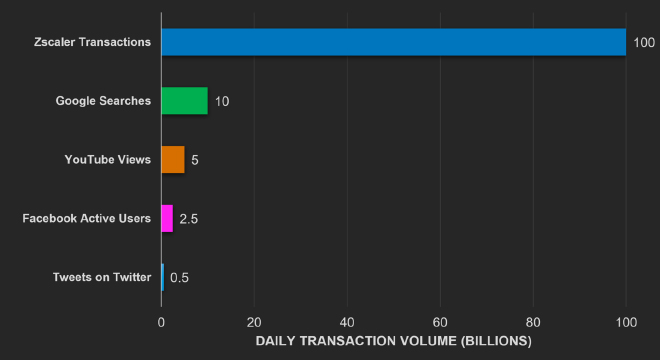 This week, the Zscaler cloud security platform reached an amazing new milestone — 100 billion transactions secured daily. To put that in perspective, you have to look at what happens daily at internet scale. The world’s population is approximately 7.6 billion of which 2.5 billion are active users on Facebook. While Google does not publicly report usage statistics, it is estimated that there are between 7 to 10 billion Google searches and around 5 billion YouTube videos viewed daily. So yes, 100 billion daily transactions through the Zscaler platform is a massive number.