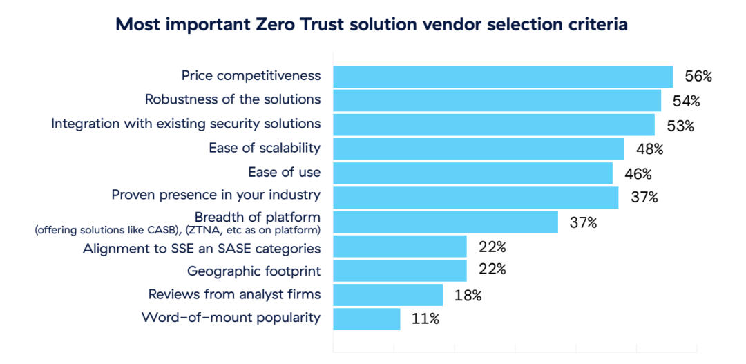 Prospective buyers of zero trust solutions consider several factors. Price is the most important for 56%, followed by robustness (54%) and integration with existing security solutions (53%). Ease of use and scalability are also significant, as are a proven presence in a particular industry and the breadth of the platform. For more insights on zero trust and key implementation elements, check out the Seven Questions Every CxO Must Ask About Zero Trust ebook.