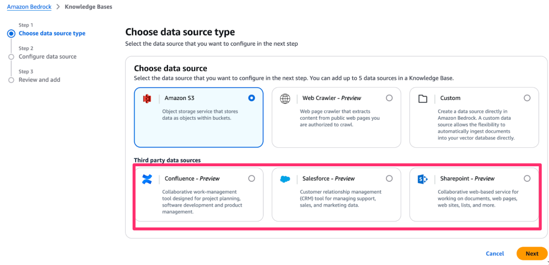 Data boundary: The RAG data is not limited to your public cloud data stores. For example, AWS Bedrock allows you to connect multiple enterprise SaaS applications as the data source for your knowledge base.