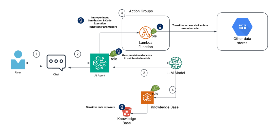 With AWS Bedrock, for example, agents can execute Lambda functions to perform additional tasks and while executing such tasks, parameters can be passed back and forth between the Agent and the Lambda function. This potentially can result in code injection and execution if proper care has not been taken. The threat model highlights potential risks associated with the various entities that are part of the AI Agent