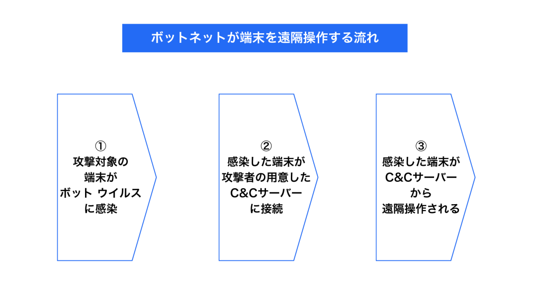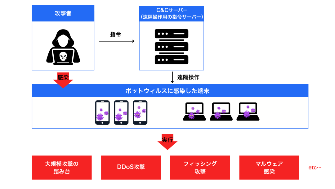 - DDoS攻撃、情報窃取、スパム送信など様々な目的に利用される