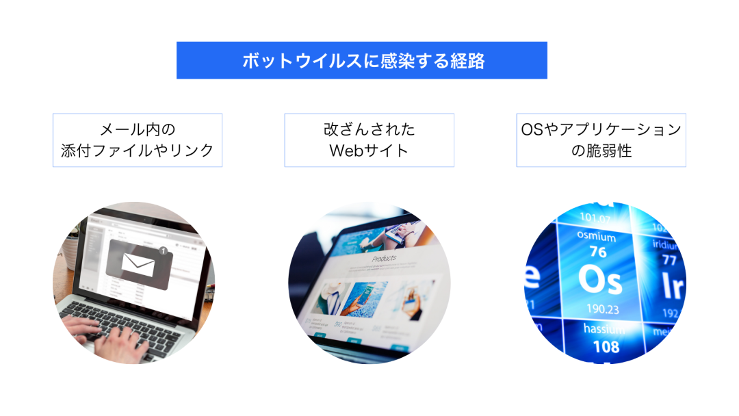 ボット ウイルスはマルウェアの一種で、感染した端末は攻撃者の指示を遠隔で受け取り、迷惑メールの送信やサイバー攻撃への加担などの不正行為を行います。