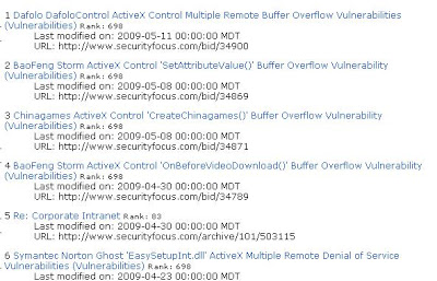 Due to the ease of exploitation with vulnerable ActiveX controls, attackers are widely using them as a popular attack vector. Heap spray code is very easy to work with and can be seen in many attacks involving ActiveX exploits. This gives the attacker the power to easily change the shellcode to whatever is required. He can then host the exploit code on the webpage and convince victims to visit the Web site, typically by getting them to click a link in an HTML e-mail link. ActiveX vulnerabilities are rising every day and people are posting exploit code on public web sites. A quick search on Securityfocus will reveal the latest ActiveX vulnerabilities as shown below: