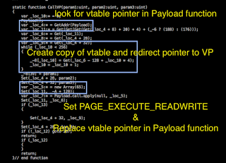 A call to the VP function is made, which replaces the vtable pointer and sets the PAGE_EXECUTE_READWRITE permission before executing the final payload.