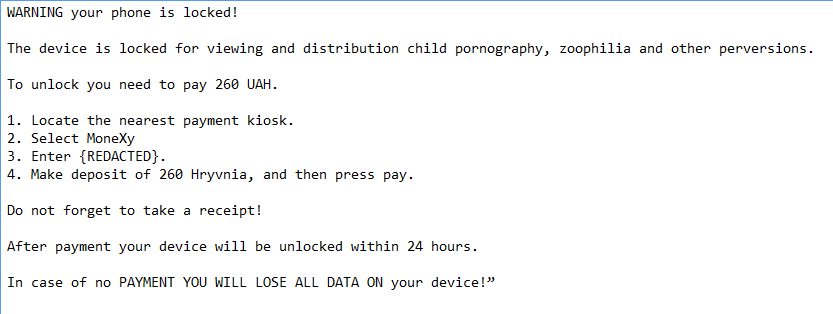 The ransom message asks for "260 Ukrainian Hryvnia" along with the threat message of deleting the data if ransom not paid.